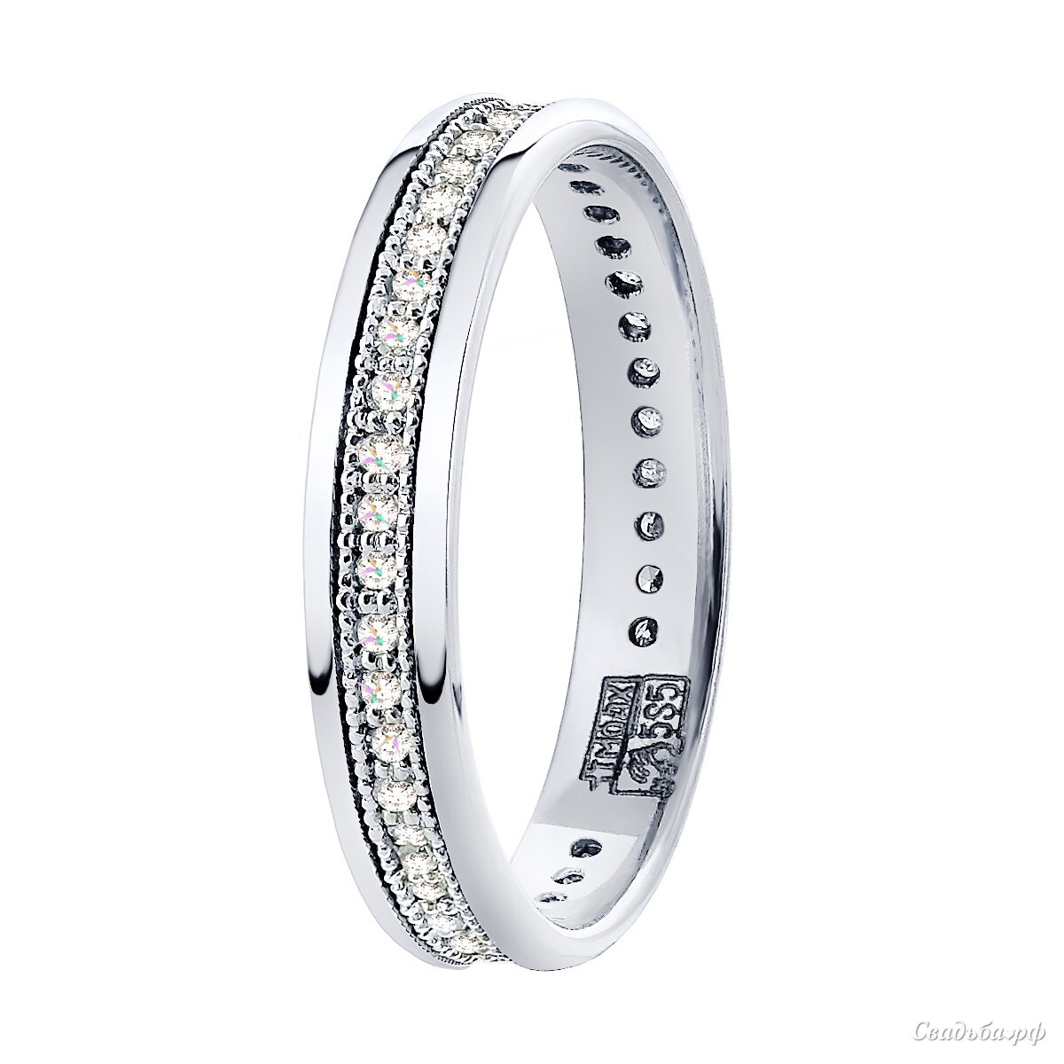 Великолепная, утонченная и элегантная модель - эти характеристики как нельзя лучше подходят к данному обручальному кольцу. Глянцевый блеск белого золота в сочетании с бриллиантовой дорожкой будет всегда смотреться на вашей руке изыскано и стильно. Приобретая эту модель будьте готовы к восторженным взглядам.