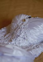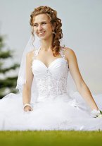 - традиционный белый цвет; - пышная юбка, украшенная оригинальным, но вместе с тем, ненавязчивым атласным бантом с лентами, доходящими почти до пола; - корсет, декорированный кружевами и стразами; - и самое главное, в нем вышла замуж самая счастливая невеста:) В подарок Вы также получите: кринолин (юбка на кольцах), перчатки и подвязку.