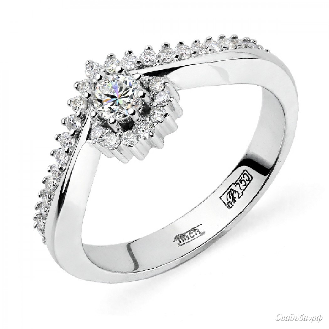 Необычное помолвочное кольцо от ведущих ювелиров России станет ярким украшением Вашего пальчика. Изделие из белого золота высочайшего качества будет радовать Вас своим блеском всю жизнь, ведь кольцо не потемнеет с годами. Изящный ободок с оригинальной вставкой усыпан сверкающими бриллиантами. Красивый символ вечной любви.